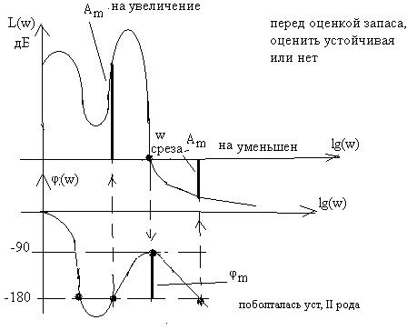 Запас устойчивости по амплитуде Аm равен отклонению ЛАЧХ от нуля на частотах пересечения ЛФЧХ линии –1800 ближайших к частоте среза ωср.