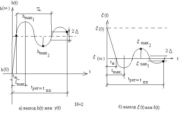 1 время регулирования (время переходного процесса) – время перехода системы в новое установившееся состояние после подачи воздействия. Время регулирования равно времени от начало процесса до момента после которого характеристика не выходит за пределы зоны 2 Δ, где Δ=0,05|(h(∞)-h(0)|