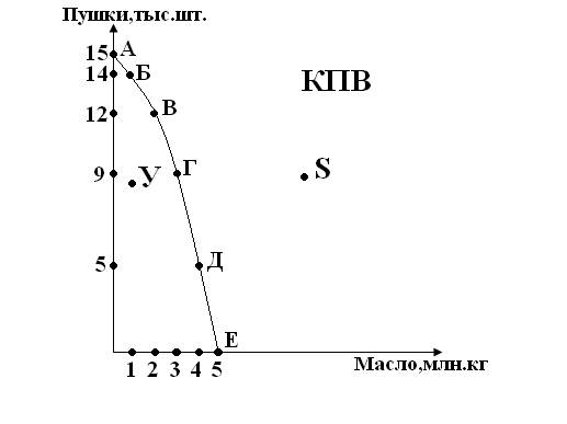 В варианте же неполной занятости производственных мощностей, безработицы, различные комбинации производства пушек и масла находятся не на КПВ, а например в т.У. Эта точка показывает, что при использовании дополнительных ресурсов можно увеличить и гражданское, и военное производство.