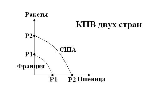 Очевидно, что производственный потенциал США мощнее, чем Франции. Даже если бы Франция решила полностью сосредоточиться на производстве ракет, то она достигла бы своего максимума в точке Р1. США, поставив аналогичную задачу достигнет максимума в производстве ракет в точке Р2. Данные графика являются лишь абстрактной моделью существующих различий производственного потенциала двух стран.