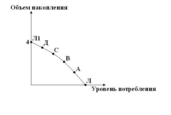 На рисунке показано соотношение между объемом накопления и уровнем потребления у 4х стран: А, В, С, Д, имеющих одну и ту же кривую производственных возможностей. Кривая ЛЛ1 демонстрирует одинаковый уровень производственных возможностей стран А, В, С, Д, но имеющих различные объемы накопления с реализацией накоплений, т.е. со строительством новых производственных объектов, страны могут переместиться на более высокий уровень производственных возможностей, в этом случае изменятся и уровни потребления в анализируемых странах.