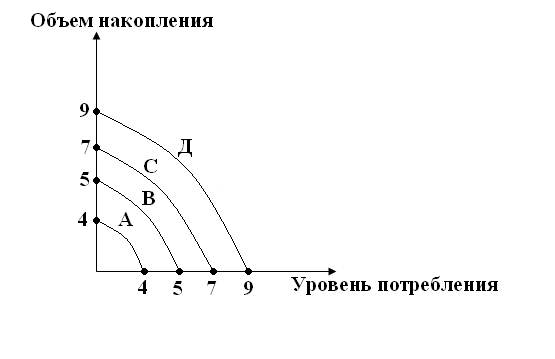 Если сравнить эти два графика, можно констатировать следующее: страны А и В, имевшие сравнительно небольшие объемы накопления, немного увеличили свои уровни потребления, иная картина наблюдается в странах С и Д.