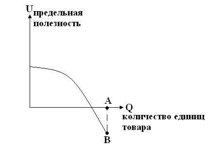 Максимальное удовлетворение общей полезности достигается в т.А, когда предельная полезность становится равной 0 (нулю). Это и означает, что благо полностью удовлетворило потребность. Если дальнейшее потребление приносит вред (предельная полезность блага отрицательная), то общая полезность снижается (отрезок АВ на обоих графиках).
