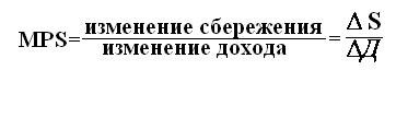 Доля любого прироста (сокращения) дохода, которая идет на сбережение, называется предельной стоимостью сбережения (МРS) или это отношение любого изменения в сбережении к тому изменению в доходе,которое его вызвало: