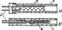 Схема двух типов рабочих чувствительных элементов из платиновой проволоки представлена на рис. В стеклянном корпусе 1 к платиновым токоподводам 2 диаметром 0,15 мм подпаяна открытая платиновая спираль 3 диаметром 0,02 мм (а) либо остеклованная 4 с диаметром 0,02 мм (б). В первом случае сопротивление чувствительного элемента составляет 10 Ом, во втором 40 Ом. Чувствительный элемент второго типа защищен от агрессивных воздействий среды, но ему присуща большая инерционность.