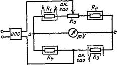 Если показывающий прибор, включенный в измерительную диагональ моста ab, имеет безнулевую шкалу, то в камерах с резисторами R2 и R4 находятся неопределяемые компоненты с концентрацией определяемого компонента, соответствующей нижнему пределу измерения прибора. Входящий в мост переменный резистор R0 служит для устранения начального небаланса моста, когда резисторы R1–R4 находятся в камерах с одинаковым составом газовых смесей.
