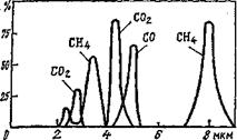 Для использования этого метода измерения необходимо, чтобы определяемый компонент имел спектр поглощения, отличающийся от спектров поглощения других компонентов анализируемой смеси. Лежащие в инфракрасной области спектры поглощения СО, СО2, NH3 и СН4 изображены на рис. 16.7. Спектры СО2 и СО, СО2 и СН4 частично перекрываются.
