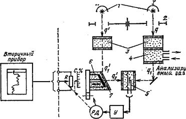 Первый оптический канал включает рабочую камеру 4, через которую протекает анализируемый газ. Вследствие поглощения излучения в рабочей камере на ее выходе световой поток q1 меньш потока q1' в канале сравнения. Поскольку в приборе используется компенсационный метод измерения, сравнительный канал II включает в себя компенсационную камеру 6, заполненную определяемым компонентом. Внутри камеры находится подвижный поршень, передняя грань 7 которого является отражающей поверхностью. Длина пути потока ql внутри камеры 6, а следовательно, и его ослабление зависит от положения поршня. Потоки q2' и q1 поступают в лучеприемник 5, заполненный анализируемым компонентом и содержащий конденсаторный преобразователь микрофонного типа.