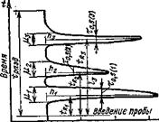 Хроматограмма (рис.) является носителем как качественной информации – о виде компонентов смеси, так и количественной – об их концентрации. Значение последней определяется площадью пика или его высотой, Поскольку разделение газов осуществляется за счет их различных сорбционных свойств, время выхода того или иного компонента при постоянной скорости газа-носителя определяет вид газа. Эта характеристика называется временем удерживания tR. Она численно равна интервалу времени от момента ввода пробы газа до момента, соответствующего максимуму пика. Более устойчивой характеристикой, не зависящей от колебаний скорости v газа-носителя, является удерживаемый объем газа-носителя VR = tR v.