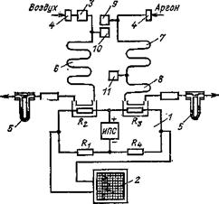 Принципиальная схема хроматографа "Газохром 3101" представлена на рис. Хроматограф является двухпоточным с газами-носителями воздухом и аргоном. Детектор 1 является комбинированным. Плечо R2 представляет собой термохимический элемент, реагирующий на выделение теплоты при реакции каталитического окисления горючих компонентов. Плечо R3 реагирует на изменения теплопроводности газа. Остальные плечи моста включают постоянные манганиновые сопротивления R1, R4. Сигнал небаланса детектора, питаемого от источника стабилизированного питания ИПС, подается на самопишущий потенциометр КСП-4 2, имеющий диапазон измерения 0–1 мВ.
