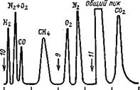 Указанная на рис. компоновка колонок используется для детектирования в смеси Н2, СО, СН4, О2, N2, СО2. При этом через колонку 6 протекает воздух, а через 7,8 – аргон. Расход каждого из газов составляет 80 см3/мин. Для определения Н2, СО и СН4 проба с предварительно удаленным СО2 подается в точку 10. Поскольку при этом анализе N2 и О2 не разделяются, проба вводится в точку 9. Для измерения содержания СО2 проба газа вводится в точку 1. Примерный вид хроматограммы представлен на рис. В зависимости от анализируемых газов компоновка разделительных колонок может меняться.