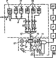 В кремнемере анализируемая вода поступает в сосуд постоянного уровня 7 через входной регулирующий вентиль 8. Под постоянным напором вода попадает в дозатор 10 при открытом электромагнитное " клапане "9. К линии подачи воды через запорные вентили подключены бачки 11, в которых находятся стандартные растворы: «нулевой» и с максимальной концентрацией определяемого компонента. В сосудах 12 находятся молибдат аммония, серная кислота и восстановитель. В смесителе 13 образуется реагентный раствор, меняющий свою окраску и ее интенсивность в присутствии ионов SiQ|~~ Блок фотометра 2 включает измерительную кювету 14, источник света 15, линзы 16, светофильтры 17, призму 18, фотодиоды 19, 20, оптический клин 21, перемещаемый реверсивным двигателем 22. Процесс измерения распадается на две стадии. Во время первой производится установка нуля и осуществляется балансировка оптической системы при наличии «нулевой пробы» в измерительной кювете. При выполнении этой стадии по команде от блока управления 3 все три реактива, находящиеся в сосудах 12, и «нулевой» раствор из сосуда 11 поступают в дозаторы 10. Затем в смесительную камеру сливаются молибдат аммония и серная кислота, тщательно перемешиваются в течение нескольких минут, после чего к ним добавляется доза «нулевого» раствора, а затем восстановитель. После перемешивания и образования кремнемолибденового комплекса раствор сливается в измерительную кювету. При выполнении этой стадии к выходу усилителя 4 подключен реверсивный двигатель 22, который балансирует измерительную схему путем перемещения оптического клина 21.