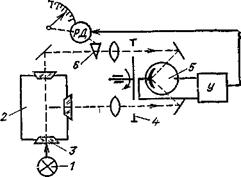 Нефелометры в основном используются для анализа эмульсий и в частности для анализа содержания нефтепродуктов в сбросных водах [26]. Принципиальная схема нефелометра с двойным оптическим каналом представлена на рис. 17.17. От источника / поток света проходит через измерительную камеру 2, снабженную стеклянными окнами 3. Прошедший через камеру 2 световой поток направляется в канал сравнения, а рассеянный — в измерительный канал. Оба потока с помощью обтюратора 4 попеременно попадают на фотоэлемент 5. Разность между рассеянным потоком и потоком сравнения зависит от концентрации взвешенных частиц. В нефелометрах используется принцип компенсации световых потоков, для чего при наличии их небаланса реверсивный двигатель РД, подключенный к выходу усилителя У, перемещает показывающую стрелку прибора и оптический клин 6, выравнивая световые потоки.