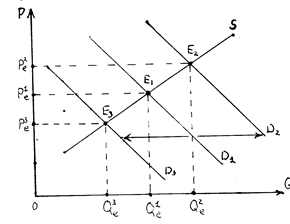 На рис. 2.9 показаны гипотетические сдвиги кривой спроса. Сдвиг кривой вправо из положения D 1 в положение D 2 означает повышение равновесной цены с P 1e до P 2e и соответствующее ему смещение равновесия из точки Е 1 в точку Е 2. При этом равновесное количество блага тоже увеличивается с Q 1е до Q 2е. Сдвиг кривой влево из положения D 1 в положение D 3 означает понижение равновесной цены с P 1e до P 3e и соответствующее ему смещение равновесия из точки Е 1 в точку Е 3. При этом равновесное количество блага тоже уменьшается с Q 1е до Q 3е.
