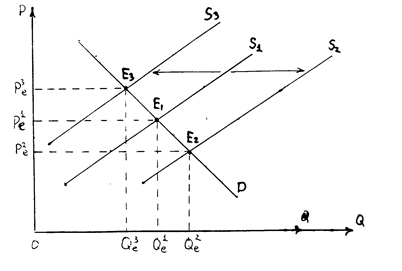 2. Изменения в предложении. Если изменяется хотя бы один из неценовых факторов предложения, то кривая предложения тоже сдвигается. Это приводит к движению вдоль кривой спроса до новой точки равновесия.