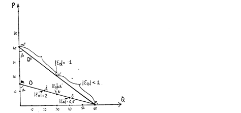 Теперь предположим, что спрос возрос так, что линия спроса сместилась в положение m ¢ n. Она теперь описывается функцией Q D = 60 - 1,5P. Хорошо видно, что угол ее наклона существенно изменился. Здесь dQ / dP = tg b = - 1,5. Однако, например, в точке u ¢ эластичность спроса равна - 1, как и в точке u на линии спроса mn.