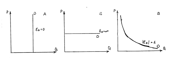 До сих пор мы стремились показать, что значения ценовой эластичности спроса различны для различных участков и точек линии, представляющих одну и ту же функцию спроса. Однако можно указать на три исключения, когда эластичность одинакова для всей кривой спроса. Во-первых, нетрудно заметить, что когда последняя представлена вертикальной прямой линией (рис. 2.13, график А), то эластичность спроса равна 0 (т.к. dQ / dP = 0). Такой спрос называют абсолютно неэластичным.
