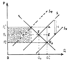 Особо подчеркнем тот факт, что при одной и той же потоварной ставке налога и субсидии и при одинаковом исходном положении линии предложения, суммарной величины налоговых поступлений не хватит для покрытия суммарной величины субсидии. На рис. 2.19 пунктиром обозначена линия предложения S t, которая показывает новое положение линии предложения в результате ввода ставки потоварного налога равной ставке потоварной субсидии. Очевидно, что суммарная величина налоговых поступлений (заполненный точками прямоугольник) значительно меньше суммарной субсидии (прямоугольника
