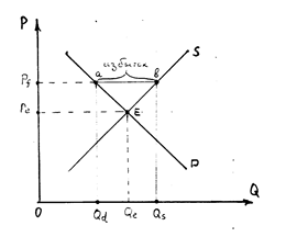 Если нижняя граница цены вводится на уровне выше равновесной рыночной цены, то появляется избыток товаров (рис. 2.20). При этой искусственно завышенной цене (P f) объём предложения (Q S)превышает объём спроса (Q D). В этом случае покупатели готовы потратить на приобретение товара лишь сумму, равную P f aQ D 0.
