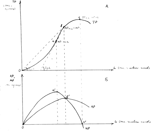 4. В точке с ТР достигает максимума, ей соответствует точка с ¢ на графике Б, где МР равен нулю.[5]