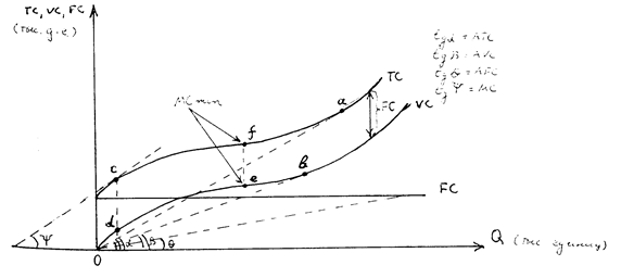 Их можно определить как D ТС /D Q. [9] На рис. 4.2 они представлены как tg y (тангенс угла, образуемого касательной к кривой ТС в точке с, и осью абсцисс). Заметим, что относительно точек на кривых ТС и VC на одной и той же вертикали предельные издержки равны между собой. Так, мы могли бы провести касательную к точке d на кривой VC, и тангенс ее угла с осью абсцисс был бы равен tg y.[10] Нельзя не обратить внимания и на точку перегиба (е) на кривой VC. В ней МС достигают минимума. То же справедливо и для точки f на кривой ТС.