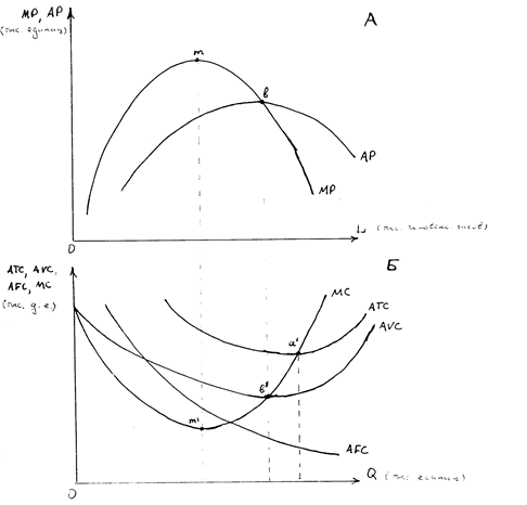 Теперь обратимся к сопоставлению среднего продукта и средних переменных издержек. Здесь все то же самое, что и в предыдущем случае. Отметим, что точке пересечения МР и АР (точка b на графике А) соответствует точка пересечения МС и AVC (точка b ¢ на графике Б). Причем если МР пересекает АР в точке максимума последнего сверху вниз, то МС пересекает AVC в точке минимума последних снизу вверх.