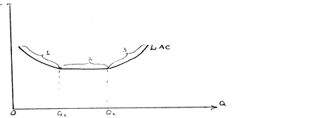 Средние и предельные издержки. Средние издержки длительного периода (LAC) убывают, если имеет место экономия от масштаба, и возрастают, если имеют место потери от масштаба. Если же нет ни экономии, ни потерь от масштаба, то эти издержки постоянны. Фирма, расширяя производство, может последовательно пройти все три стадии, - от экономии от масштаба до потерь от масштаба. В этом случае говорят, что у нее «тарелкообразная» кривая средних издержек длительного периода (рис. 8.8).
