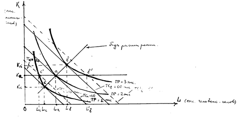 Далее предположим, что фирма расширила выпуск до 3 тыс. единиц продукции. Если она находится в долгосрочном периоде, то она может расширить оба ресурса (капитал с K a до K b и труд с L a до L b) ипройти по пути расширения в точку b. Пусть ТС b = 60 тыс. денежных единиц, тогда по-прежнему LAC = 20 денежным единицам. Но если фирма действует в краткосрочном периоде, то она ради получения 3 тыс. единиц продукции может только расширить использование труда (с L a до L ¢b, а капитал остается в ее распоряжении в прежнем количестве K a). Тогда она попадает в точку b ¢ на изокванте, соответствующей выпуску 3 тыс. единиц продукции. Этой точке соответствует изокоста ТС¢b = 66 тыс. денежных единиц. Следовательно, теперь АТС = 22. Значит они больше LAC.