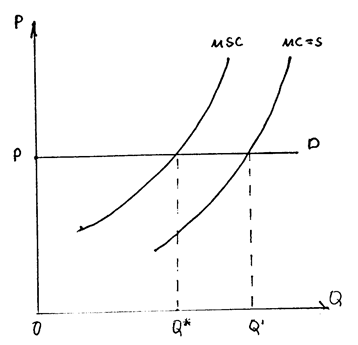 На рис. 15.2 общественно эффективный выпуск химзавода будет Q *, где P = MSC. Химзавод, однако, будет выпускать объем продукции, равный Q ¢ (где P = MC), который превышает эффективный уровень. Таким образом внешние издержки ведут к перепроизводству с точки зрения общественных интересов.