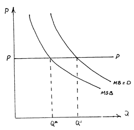 На рис. 15.3 изображены предельная полезность и цена использования автомобилем для его владельца. Число поездок на дачу автомобилистом составит Q ¢, то есть установится там, где MВ = P (где цена есть стоимость бензина, масла, износа покрышек и т.п. на одну поездку). Общественно эффективное количество поездок, однако, было бы меньше Q ¢, а именно, - Q *, то есть соответствовало бы такому количеству, при котором MSB = Р. Здесь превышение MВ над MSB есть MEC (для потребителей).