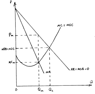 Всегда, когда на рынках имеет место монополия, монопсония или же какая-либо форма несовершенной конкуренции, рынок не в состоянии установить равенство между MSB и MSC. Это показано с помощью рис. 15.4, который показывает кривые выручки и издержек для монополиста. При этом предполагается, что внешние эффекты отсутствуют. Общественно эффективный выпуск равен Q c, при котором MSB = MSC. Монополист, однако, производит меньшее количество, равное Q m, при котором MR = MC.