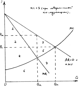 Здесь нужно сделать одну оговорку. Строго говоря, площадь под кривой МС – это общие переменные издержки. Для того чтобы получить излишек производителей необходимо из суммы площадей 4 и 5 вычесть и все постоянные издержки. Но так как постоянные издержки не изменяются с изменением выпуска, то они не влияют на дальнейшие рассуждения, относящиеся к излишку производителей при совершенной конкуренции и монополии. В принципе, можно считать, что постоянные издержки отсутствуют (что, как мы уже знаем, справедливо для длительного периода).