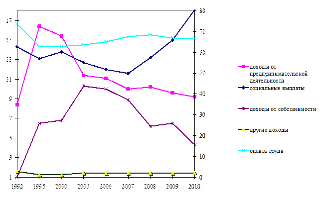 Целесообразно учитывать и наблюдающуюся динамику перераспределения доходов домохозяйств по функциональному критерию: например, доля заработной платы в суммарном объеме денежных доходов населения сократилась с 66,5% в 1999 году до 63,9% в 2003 году, а доходы от предпринимательской деятельности за этот же период почти не изменились (12,4% и 12,0% соответственно).