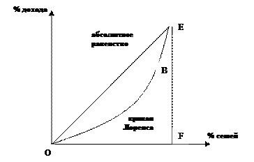 Линия ОЕ является биссектрисой и показывает состояние абсолютного равенства в обществе (если все получают поровну, то 20% населения получит 20% общего дохода, 40% населения – точно 40% и т. д), а линия ОЕF - абсолютного неравенства – (рис.1).. Кривая Лоренца ОЕВ отражает фактическое распределение доходов. Чем больше неравенство в обществе, тем дальше от биссектрисы отклоняется кривая Лоренца.