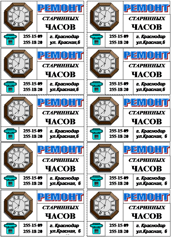 Ниже показано размножение личной визитной карточки в десяти экземплярах (в уменьшенном масштабе).