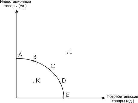 Кривая производственных возможностей показывает альтернативные варианты при полном, а, значит, эффективном использовании всех ресурсов. На графике это точки A, B, C, D, E. Точка K означает неполное, то есть неэффективное использование всех ресурсов, точка L – жизнь в долг или невозможность.