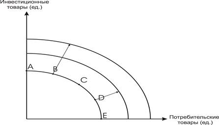 2) все ресурсы расходуются на производство двух групп товаров: потребительских товаров (для настоящего) и инвестиционных товаров (для будущего).