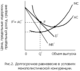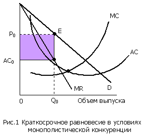 На рынке монополистической конкуренции кривая спроса имеет наклон вниз, т.к. хотя на рынке товарной группы много конкурентов, на рынке разновидности товара фирма – монополия. В краткосрочном периоде возможны прибыли. В длительном периоде прибыль нулевая.