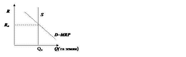 Рассмотрим на примере земли. Спрос на землю обратно пропорционален ренте, т.е. это нисходящая линия на графике, что связано с законом убывающего плодородия земли А.Тюрго. В соответствии с этим законом, по мере вовлечения в оборот новых участков земли, плодородие земли убывает. При этом убывает и MRP земли, а значит, снижается и рента. Пусть земля однородна и используется для производства и возделывания какой-либо монокультуры, Rо – равновесная рента. Предложение земли является фиксированным во времени, т.к. территория земли const.