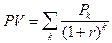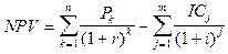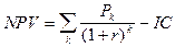 Допустим, делается прогноз, что инвестиция (IС) будет генерировать в течение n лет годовые доходы в размере P1, P2,..., Рn. Общая накопленная величина дисконтированных доходов (PV) и чистый приведенный эффект (NPV) соответственно рассчитываются по формулам: