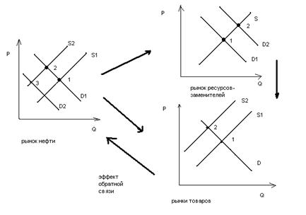 На рынке нефти с появлением ОПЕК произошло сокращение поставок нефти на мировой рынок. Это повлияло на рынки других ресурсов (газ, уголь, электрическая энергия) – спрос вырос, также выросли цены. На рынках всех товаров произошел рост издержек производства и сокращение предложения – в экономиках многих стран спад производства и инфляция. Экономия ресурсов, использование нововведений вызвало сокращение спроса на нефть и последующее снижение цены.