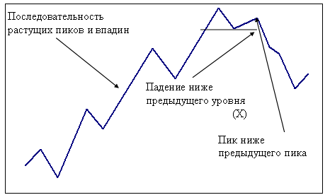 Одним простым базовым методом является метод последовательности пиков и впадин, который основывается на замеченной Чарльзом Доу закономерности, заключающейся в том, что изменения цен растущего рынка представляют собой последовательность волн, в которой каждая последующая поддержка или реакция находится выше своей предшественницы. Прерывание в последовательности растущих пиков и впадин является сигналом разворота.