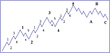 Итак, согласно теории Эллиотта, полный бычий-медвежий цикл, заключенный между впадинами медвежьих фаз состоит из 8 волн: пять волн составляют бычью фазу цикла, а три - медвежью.