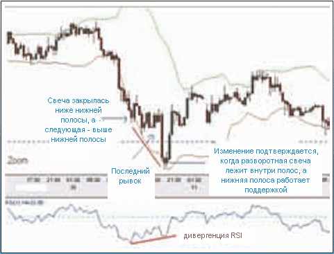 Чтобы правильно идентифицировать такие ситуации, нам могут немного помочь Полосы Боллинджера. Так как данные объема на форексе труднодоступны, замечено, что Полосы Боллинджера - лучший способ измерить волатильность цены. Мы ищем изменение волатильности, которое предшествует дивергенции.