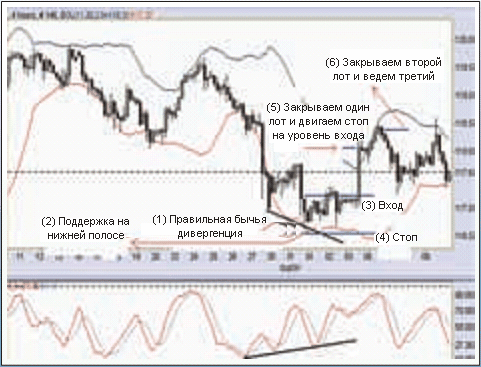 Этот рисунок показывает полную последовательность сделки на основании типичной Бычьей Правильной Дивергенции. Здесь шаг за шагом описана сделка от входа до стопа и выхода, а так же управление капиталом.