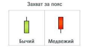 Захват за пояс (belt-hold line) — существуют две разновидности данной свечи: бычья и медвежья. Бычий захват за пояс — это высокая зеленая свеча с ценой открытия на уровне минимума. Она является бычьим сигналом, если появляется в области низких цен. Медвежий захват за пояс — это длинная красная свеча с ценой открытия на уровне максимума. Она считается медвежьим сигналом, если появляется в области высоких цен.