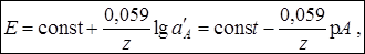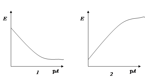 Рис. 19. Зависимость потенциала ИСЭ от pA: 1 – для катионов (z – положительная величина); 2 – для анионов (z – отрицательная величина).