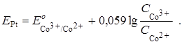 Индикаторным электродом является инертный платиновый электрод. Его потенциал до т. э. определяется наличием пары Co3+/Co2+, т. к. в растворе имеется ещё неоттитрованный Co2+ и образовавшийся продукт реакции – Co3+. Следовательно, уравнение Нернста для платинового электрода до т. э. запишется в виде