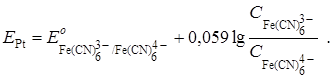 в ходе которой ни один элемент не меняет степени окисления, т. е. ни одной окислительно-восстановительной пары в растворе нет и платиновый электрод использовать невозможно. Но если добавить в раствор до начала титрования немного K3[Fe(CN)6], то в нём появляется пара