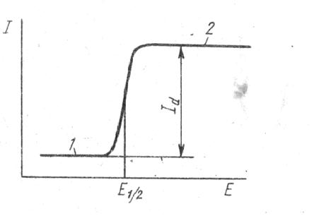 Электролитическая ячейка состоит из рабочего поляризуемого электрода с малой поверхностью и неполяризуемого электрода сравнения. В качестве материала рабочего электрода могут использоваться вещества, для которых в водном растворе характерна поляризация. Это ртуть, графит, платина, золото. В качестве электрода сравнения используются неполяризуемые электроды, например хлоридсеребряный. На электролитическую ячейку подают плавно возрастающее напряжение от внешнего источника и регистрируют протекающий в ней ток. Если в растворе отсутствуют электрохимически активные ионы, то получается зависимость I = f(E), имеющая вид представленной на рис. 24 кривой 2. Если в растворе присутствует электрохимически активное вещество, то наблюдается волна (рис. 25).